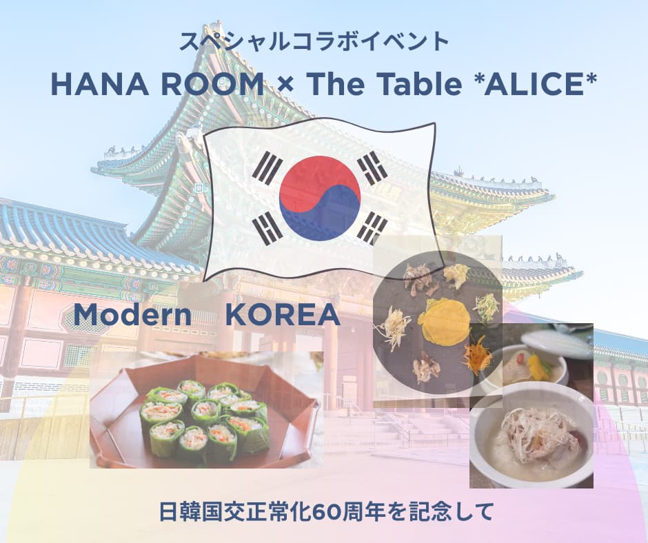 - HANA ROOM オーナー 韓国郷土料理研究家 金美善氏をお迎えし、いま人気の高まっているコーリアフレンチ料理とThe Table *ALICE* (主宰竹内薫)のテーブルコーディネート&演出でお届けいたします。