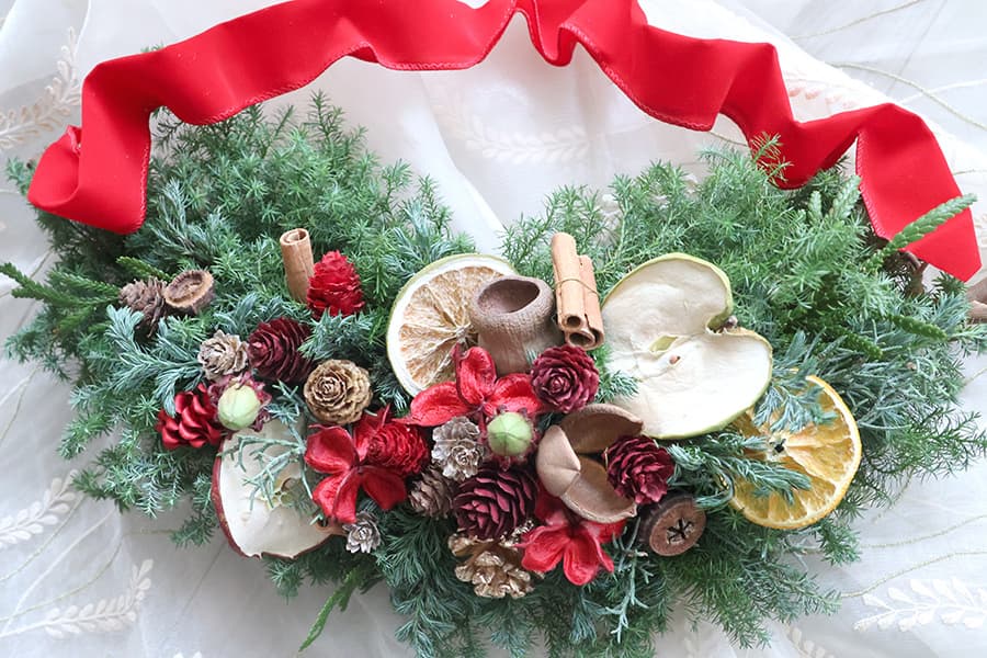 - 赤や緑の伝統色に木の実を合わせシックなバーガディのクリスマスリースをクレッセント型で作ります。トレンドの素敵なClassicスタイルをお楽しみください。