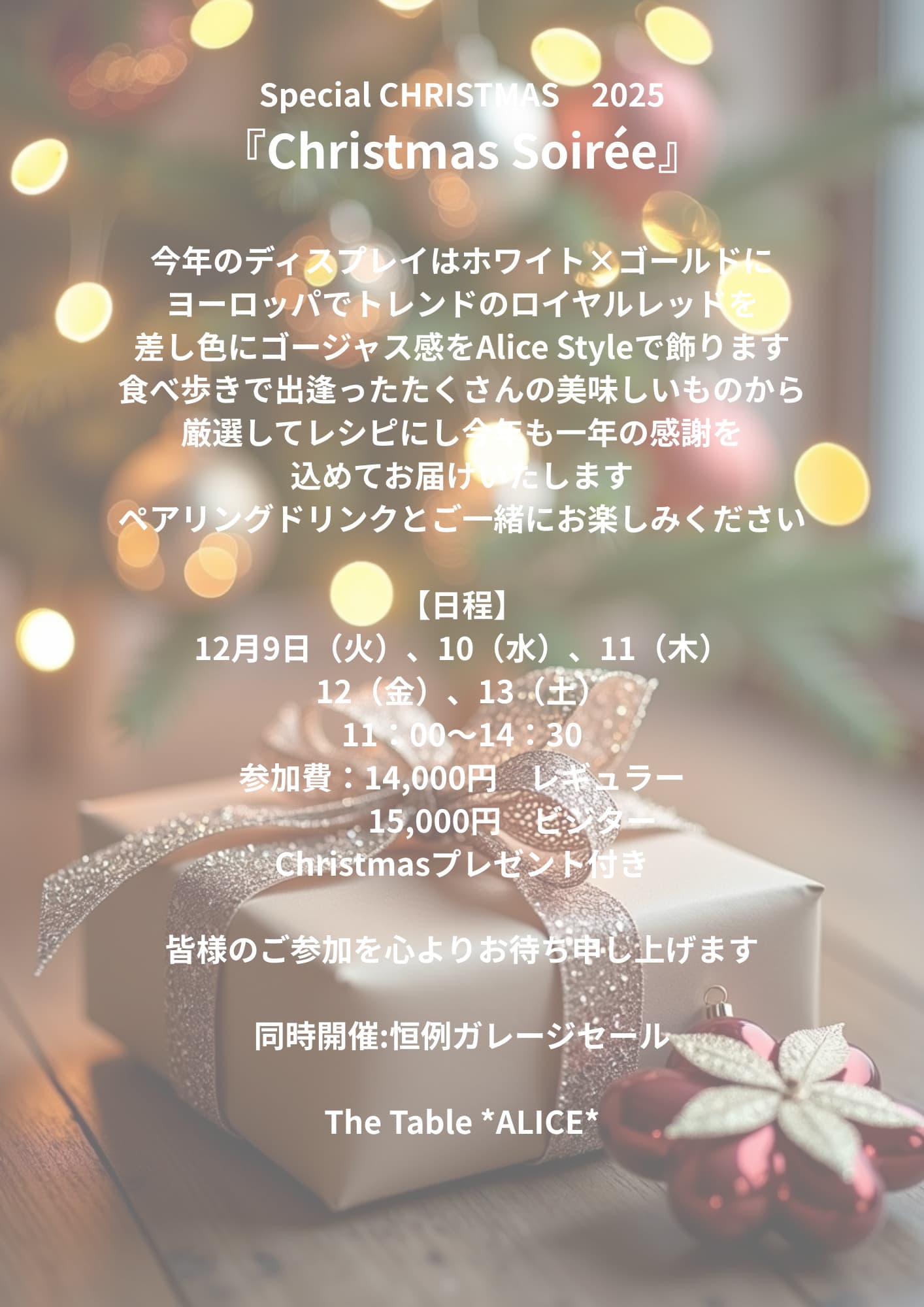 - 内容:今年の食べ歩きで出逢った沢山の美味しいものから厳選しレシピにしてお届けいたします。ソワレのゴージャス感をAliceStyleの演出。どこにもないクリスマスをお楽しみください。今年も一年の感謝を込めて・・・。